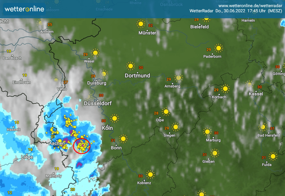 Gerade die Gewitter zwischen Aachen und Bonn haben es ganz schön in sich. Neben Starkregen und Hagel sind auch viele Blitze dabei. Diese Front nimmt jetzt Kurs auf die Regionen westlich des bergischen Landes.