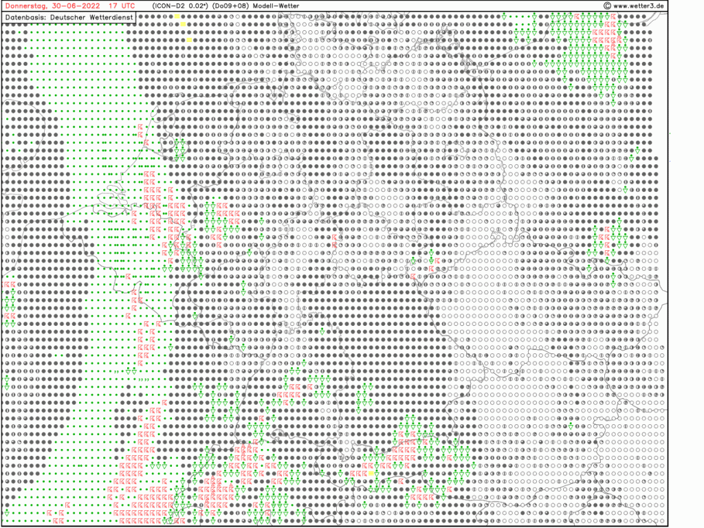 Zur Erklärung: die weißen Punkte sind wolkenloses Wetter, die grauen Punkte bedecktes Wetter, die grünen Dreiecke mit Punkt oben drauf stellen Schauer dar, die grünen Punkte Regen, die roten Symbole symbolisieren Gewitter.