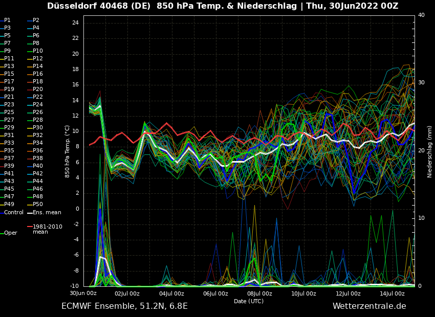 Etwas, was das ECMWF ziemlich ähnlich sieht, wobei hier das Temperaturniveau etwas höher ist. Niederschlag aber ebenfalls große Mangelware.