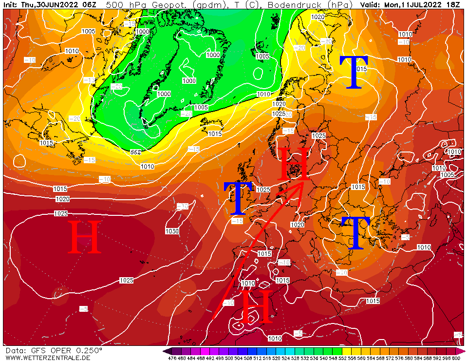 Wir hätten zum einen das Azorenhoch, welches sich weit auf den Atlantik treiben lässt. In der Höhe ist es westlich am stärksten ausgeprägt, am Boden nördlich der Azoren. Dieses Azorenhoch schickt ein Ablegerhoch nach Norddeutschland, sodass dort eine Achse der beiden Hochs entsteht. Diese Achse ist relativ anfällig, sodass sich schnell ein höhen Tief einnisten kann, was wir so in den Bodendruckkarten gar nicht erkennen würden. Da gibt es aber noch ein zweites Hoch über dem iberischen Raum, der eine Achse zum Hoch über Norddeutschland basteln will. Somit kann dann auch die Hitze aus dem Südwesten zu uns wandern. Das Hoch wird folglich aber weiterziehen, sodass auch diese Achse nur kurzzeitig bestand hat.