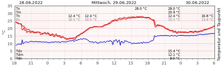 Mit 20,9 °C lag das Tagesmittel einmal mehr über der 20 °C-Marke und somit auch 2,7 °C über dem langjährigen Mittel aus 30 Jahren für einen 29. Juni.