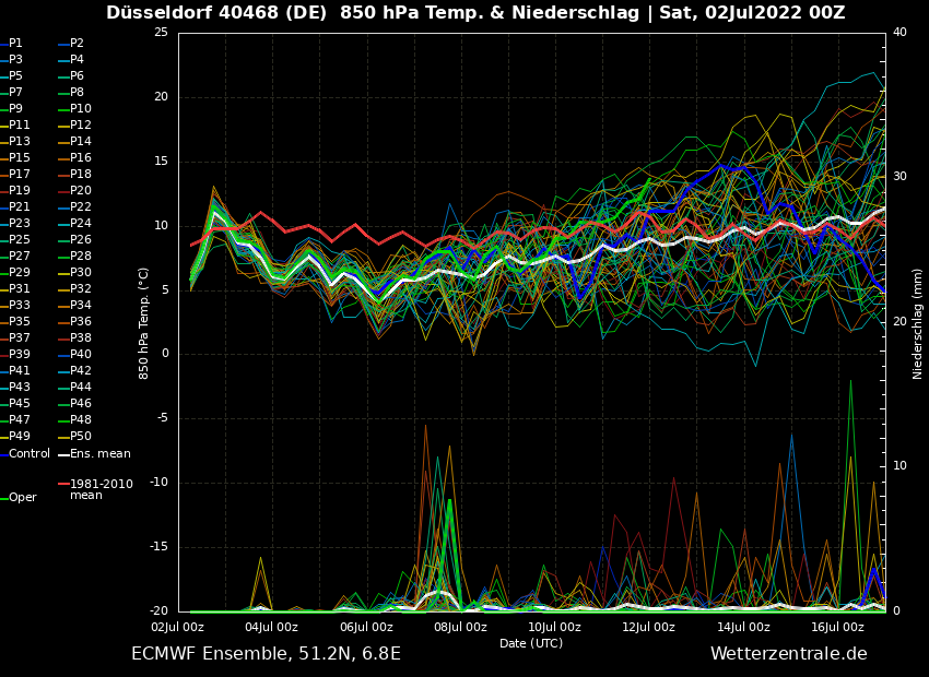 Nach dem warmen Wochenende baut sich die sommerliche Luft wieder ab, anschließend gibt es vereinzelte Schauer, das ECMWF haut für den 7. Juli noch etwas mehr Regen raus als das GFS. Danach erholen sich die Temperaturen wieder langsam, der Kontrolllauf bewegt sich beispielsweise in Richtung 30 °C als Tageshöchsttemperatur rund um den 13. Juli, alles ohne Niederschläge. Es wird also an einer möglichen Hitzewelle (5 aufeinanderfolgende Tage mit >30,0 °C) gearbeitet.