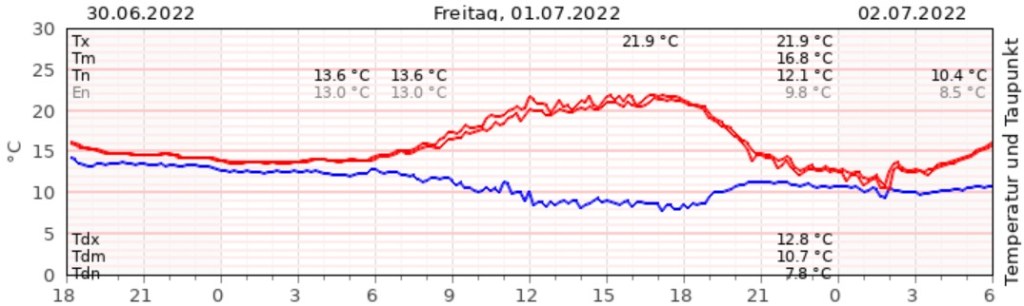 Ein Mix aus Sonne und Wolken prägte den gestrigen Start in den Juli. Mit 21,9 °C war es verhältnismäßig kühl, die Tagesmitteltemperatur lag mit 16,8 °C allerdings nur 1,5 °C unter dem Mittel aus 30 Jahren für einen 1. Juli. Ansonsten wenig Auffälligkeiten.