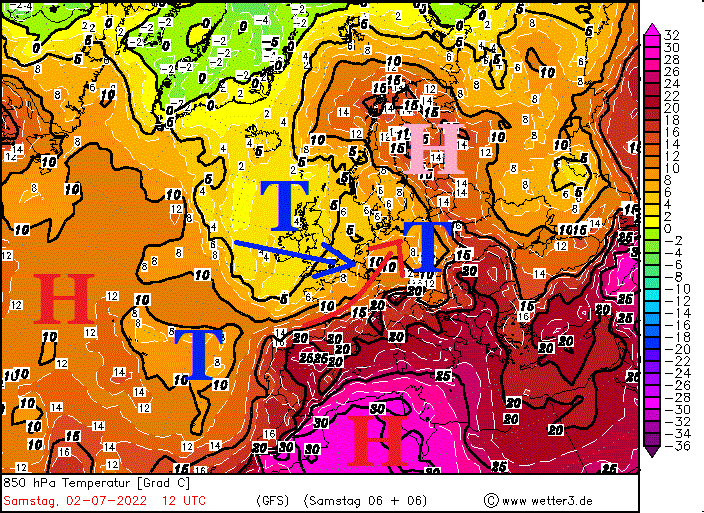 Heute ein ähnliches Bild, aber: Wenn wir auf die Luftmasse in 5.500 Meter Höhe achten, dann wurden gestern noch gut -12 °C berechnet, heute -5 °C. Das ist ein gewaltiger Unterschied, weil obwohl die Luftmasse in 1.500 Meter Höhe temperaturtechnisch kaum einen Unterschied liefert, ist die Luft eine völlig andere, deutlich stabiler und somit mit viel mehr Sonne begleitet, Schauer wären damit so gut wie auszuschließen. Nichtsdestotrotz liegen wir immer noch im Einflussbereich der Tiefs aus dem Norden, die die kühle Luft zu uns lenken und folglich die Temperaturen bei uns nicht über 31 °C steigen würden. Sollte sich die über Spanien und Frankreich liegende Hitze nach Deutschland aufmachen, sind wir fix bei um die 39 °C, was wir gleich auch in den Ensembles sehen werden.