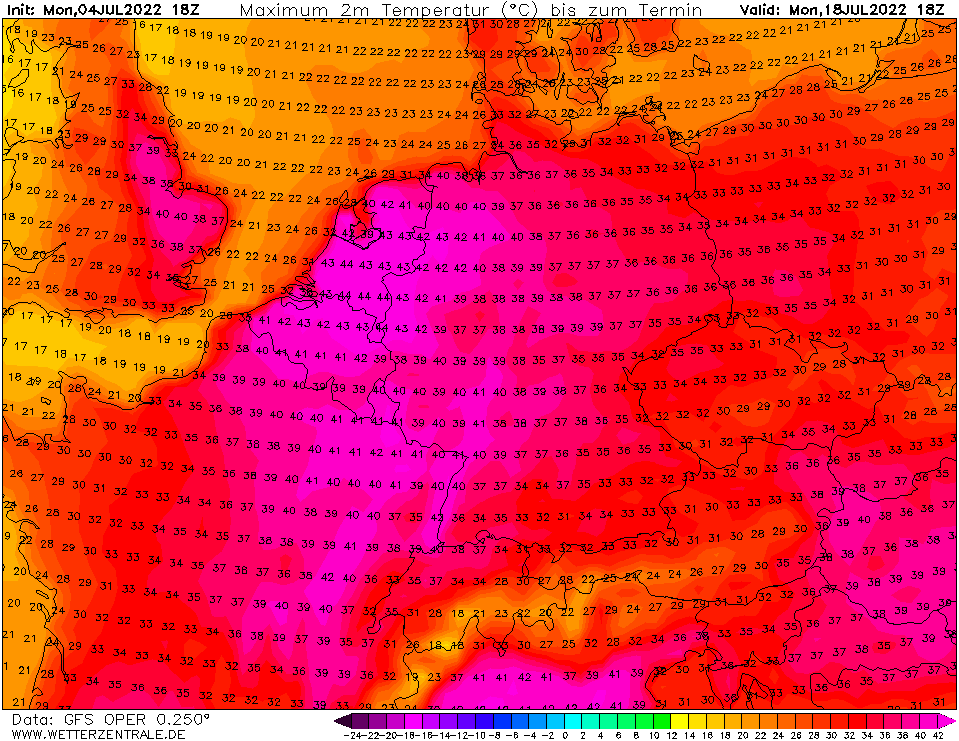Also werfen wir wieder den Blick auf das höchste der Gefühle der vergangenen 4 Berechnungen des amerikanischen Wettermodells im direkten Modelloutput. 34 °C zum Montag, 18. Juli.
