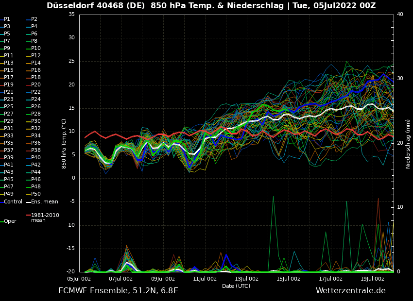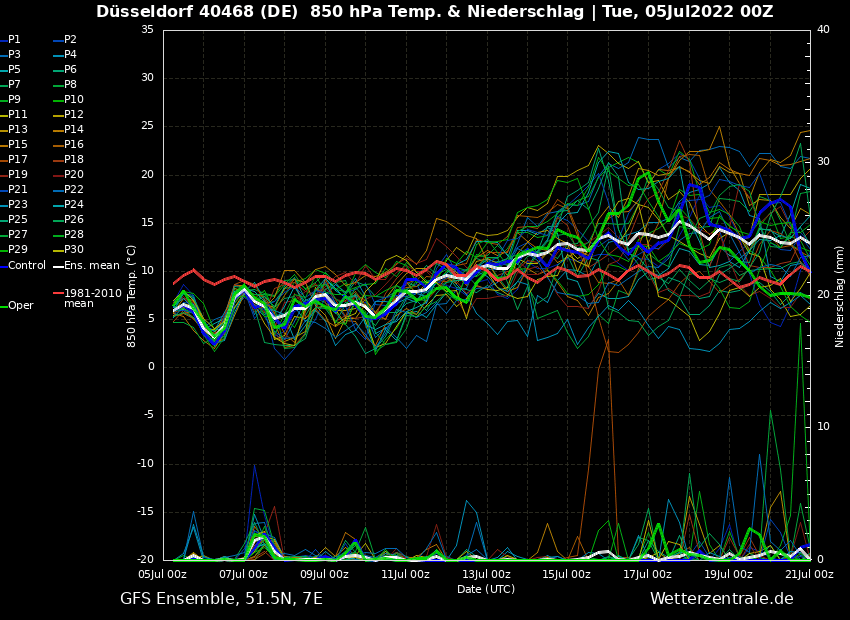 Auch das ECMWF macht den Hitzeberg in Richtung 15 °C in 1.500 Meter Höhe und auch hier wandern die einzelnen Modelle bis weit über 15 °C hoch, dabei alles ziemlich beständig und ohne nennenswerten Niederschlag. Auf uns wartet eine trockene und heiße Witterungsphase ab dem 13. Juli.