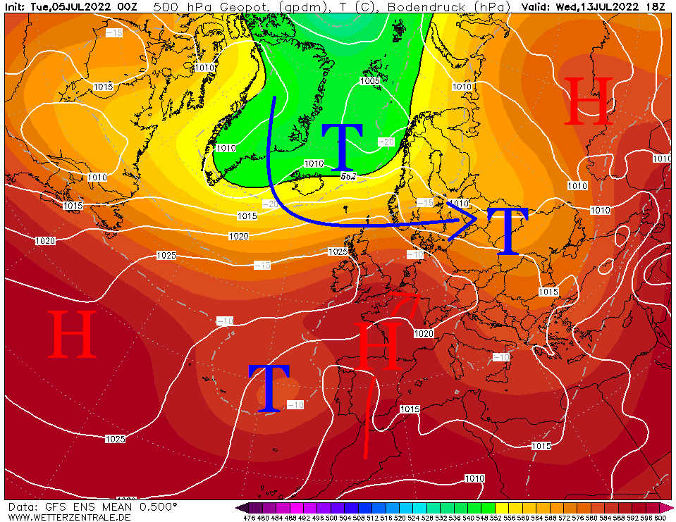 Manchmal schaue ich mir ein Wettermodell an und sehe eine Auffälligkeit, die ich dann genauer betrachte. Heute habe ich gezielt nach einer Wetterlage gesucht und gefunden. Zum 13. Juli sollen sich die Tiefs aus dem Norden mit der kühlen Luft verziehen und das von mir vorhin angesprochene Tief bei den Azoren in Richtung Portugal wandern. Dadurch kommt ein Schwall nordafrikanische Hitze in Richtung Europa in Gang und darauf legt sich ein Hoch, welches die Hitze mitnimmt. Eine klassische Lage für eine Hitzewelle.