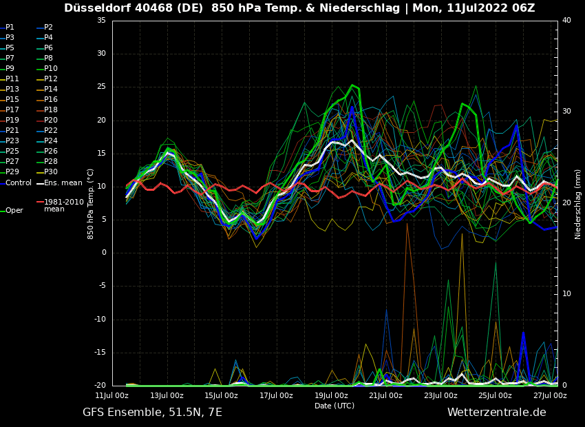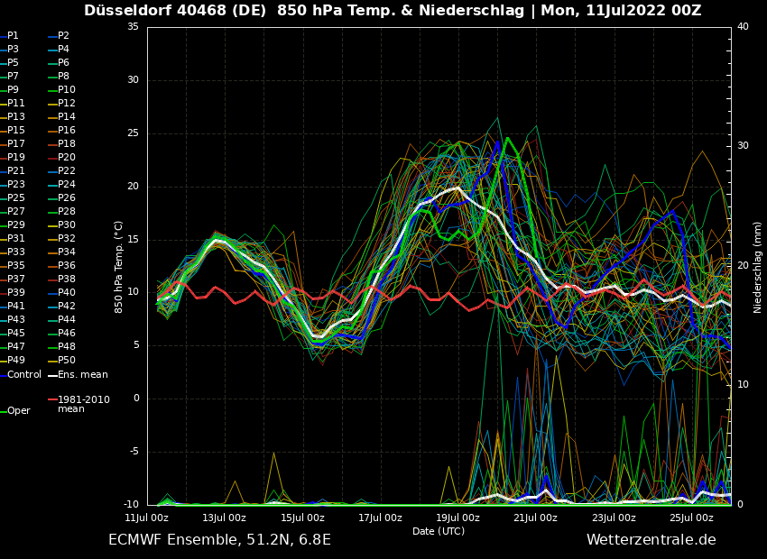 Ähnlich sieht es auch das ECMWF, was dazu durchaus auch etwas Krawall beim Abräumen der Hitze ins Gespräch bringt. Hier spielt eine erneute Hitze zum 23. Juli nur wenig Rolle, wird aber auch u. a. vom Kontrolllauf berechnet.