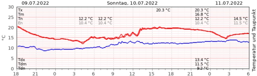 Auch der gestrige Tag lieferte uns wenige Highlights. Mit 20,3 °C war es ein ausgesprochen kühler Tag, auch die Tagesmitteltemperatur von 16,8 °C lag weiter unter dem, was wir für einen 10. Juli erwarten dürften (-3,1 °C). Dazu viele Wolken, die Sonne kam kaum durch und zwischenzeitlich gab es etwas Regen. Der Wind war lediglich in Nähe der regnerischen Phasen etwas unangenehmer.