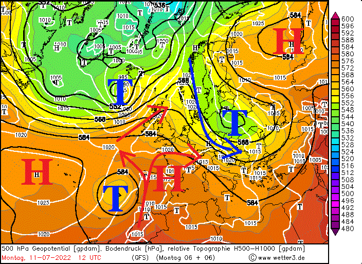 Wir haben nun ausgiebig über das gesprochen, was uns in Form von Hitze zum kommenden Wochenende / darauffolgenden Tage erwarten könnte. Deshalb blicken wir heute mal etwas weiter und schauen auf die Großwetterlage in 12 Tagen. Diese bringt uns nämlich klassischen mitteleuropäischen Sommer, bei dem wir unter keinem richtigen Druckgebilde liegen, die Hochs über dem Süden mit der Hitze weit weg liegen und die Tiefs mit der kühlen Luft im Norden sich ebenfalls weit von uns fernhalten. Wir haben, und das finde ich interessant, immer noch ein Tief vor der iberischen Halbinsel liegen mit dieser leichten Welle des Geopotentials in 5.500 Meter Höhe. Hitze also immer noch möglich? Wer sich die Ensembles gestern angeschaut hat und den 0er Lauf des amerikanischen GFS gesehen hat, dem ist aufgefallen, dass diese dicke grüne Linie zum 25. Juli nochmal ordentlich nach oben ausgeschlagen ist, also so ziemlich einziger Lauf. Ich glaube, dabei bleibt es auch.