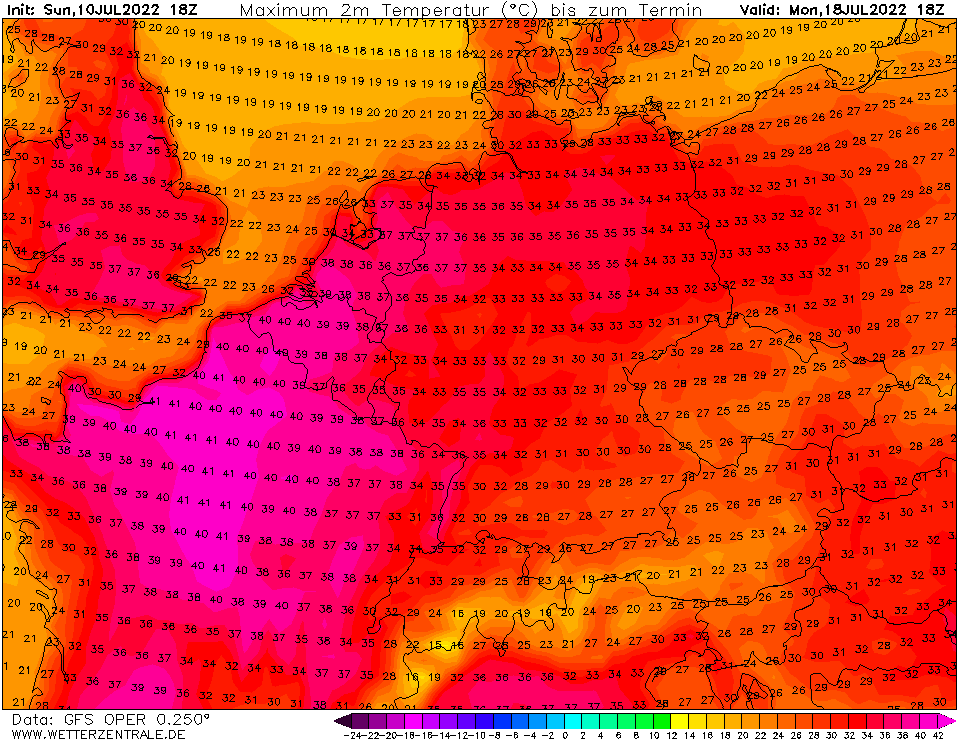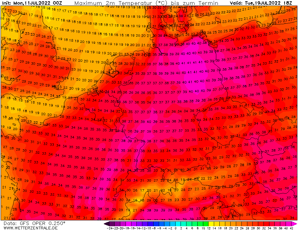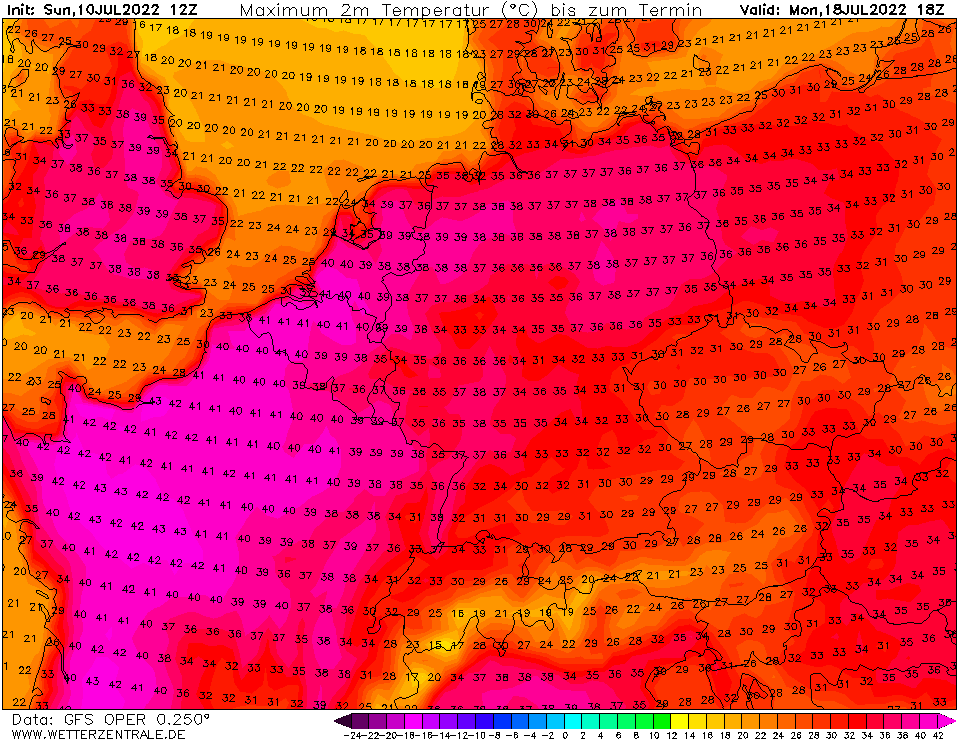 Zum Schluss noch fix die Modellläufe des amerikanischen GFS mit seiner jeweiligen Höchsttemperatur. Der 12er Lauf gestern brachte maximal 38 °C zum Montag, 18. Juli.