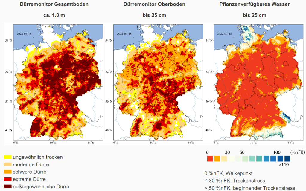Und dieser Blick kommt nicht von ungefähr. Seit nun mehr als knapp 4 Wochen hat es nicht mehr richtig bei uns geregnet, entsprechend trocken sind die Böden und entsprechend gelblicher wird aktuell unsere Natur. Bis auf ganz wenige Flecken (Schleswig-Holstein, bayrischer Alpenrand, bayrischer Wald) herrscht in ganz Deutschland Trockenheit. In vielen Regionen ist diese Trockenheit so enorm, dass von einer moderaten Dürre oder schlimmer die Rede ist. Und das nur auf die Bodenschicht bis 25 cm bezogen, über dem Gesamtboden bis 1,8 Meter Tiefe sieht die Situation noch prekärer aus. Was mich nun aber am meisten besorgt ist der Blick auf die rechte Grafik, sodass sich die Pflanzen in fast ganz Deutschland bereits in Richtung Welkepunkt bewegen oder schon dort angekommen sind.