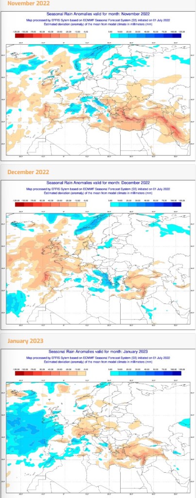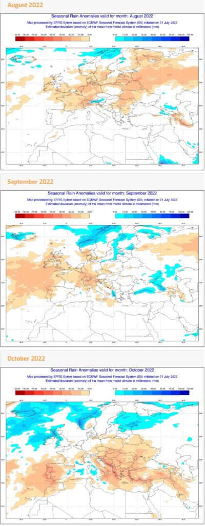 Das EFFIS macht dies relativ ähnlich, wobei hier die Trockenheit bis in den September definitiv reingehen soll und dann vermehrt Niederschläge aufkommen sollen.
