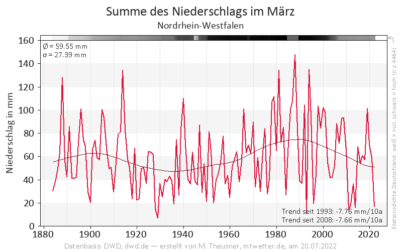 Im März geht der Trend in die andere Richtung. Hier bleiben auf 10 Jahre gesehen -13,28 % der Niederschläge auf der Strecke, die es zuvor sonst im März gegeben hat. Und hier fängt der Trend an übel zu werden.