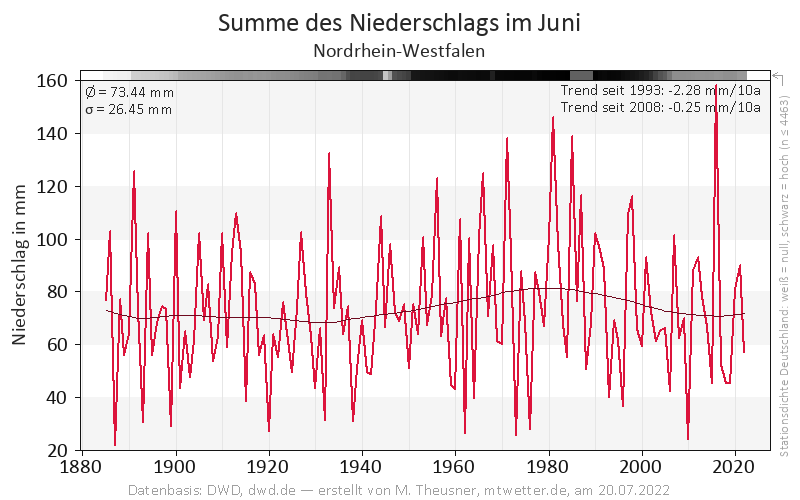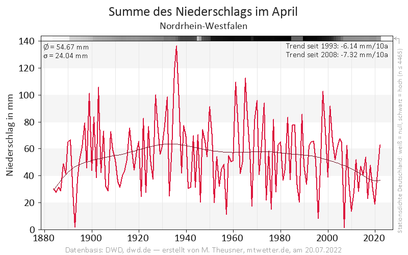 Und auch der Mai ist rückläufig, was die Niederschläge angeht. Hier ist der Rückgang auf 10 Jahre gesehen bei -13,7 %. So fehlen alleine in den Frühlingsmonaten mittlerweile gut 25 Liter pro m², jedes Jahr.