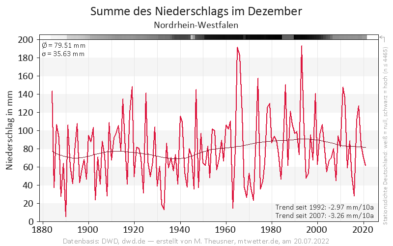 Und auch im Dezember gehen die Niederschläge leicht zurück, etwa -3,93 % auf 10 Jahre gesehen.