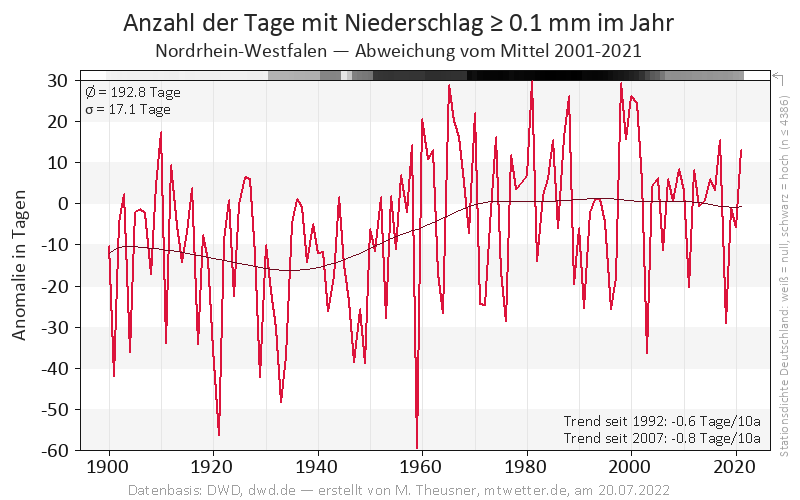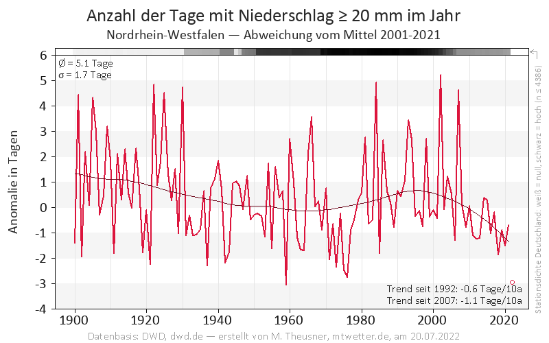 Zu guter Letzt noch der Blick auf die Tage mit mehr als 20 Liter pro m², wo der Trend ebenfalls deutlich rückläufig ist. Diese Tage können wir aber getrost ausklammern, weil so viel Wasser von der Natur selten aufgenommen werden kann.