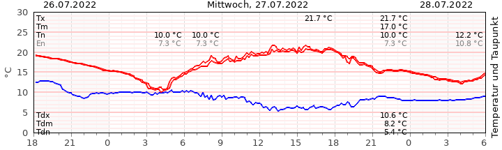 Der kühlste Tag der Woche liegt hinter uns, ab nun wird es wieder deutlich wärmer. Mit 21,7 °C als Maximaltemperatur erlebten wir gestern den kühlsten Tag seit dem 12. Juli, im Bezug auf das langjährige Mittel aus den vergangenen 30 Jahren für den jeweiligen Tag war es mit 17,0 °C (-3,4 °C) der kühlste Tag des Monats. Ansonsten war es ein Tag geprägt von ruhigem und wolkigem Wetter.