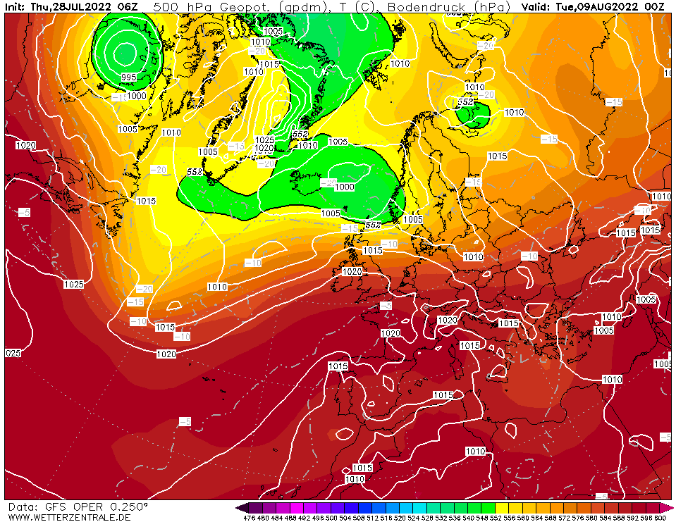 Wir lassen heute ausnahmsweise mal die von mir eingezeichneten Druckgebilde vermissen und blicken stattdessen auf das farbliche Gebilde über Europa. Das Hoch über den Azoren zieht weiter einsam seine Kreise, vom Norden her scheren die Tiefs mit ihrer kühlen Luft in 5.500 Meter Höhe (grüne Farbe als Gradmesser) bis nach Schottland und Ostsee aus, wir liegen irgendwo zwischen dieser kühlen Luft mit Schauern und der heißen Luft im Süden. Gerade über Nordmarokko baut sich abermals eine neue Hitzewelle auf.