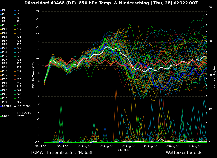 Das ECMWF sieht das ein bisschen anders. Es macht zwar auch einen deutlich wärmeres Wetter rund um den 3. August, danach sollten die Modelle aber deutlich weiter zurückgehen und damit auch die Temperaturen. Die Ausreißer bewegen sich zwar auf ähnlichem Niveau, die Vielzahl der kühlen Läufer sind hier aber deutlich mehr ausgeprägt als beim GFS. Hinter den Kulissen werden aber auch hier nach die kühleren Temperaturen vom dem Hoch gestützt, welches von den Azoren zu uns ziehen soll. Der Unterschied liegt darin, dass das GFS eher eine westliche bis südwestliche Luftströmung bringt, das ECMWF sieht die Luft eher aus Nordwest kommend.