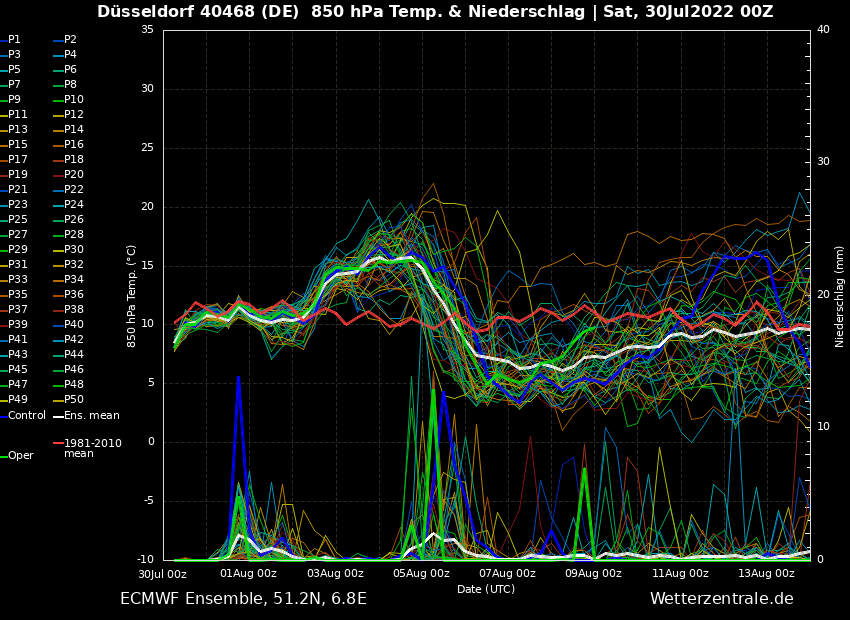 Das ECMWF ist da in seinen Aussagen deutlicher. Auch hier gibt es Niederschlagssignale zum morgigen Abend, auch wenn diese etwas ausgeprägter erscheinen. Hier ist entscheidend, wie kräftig die Schauer werden und wie viel Regen noch in der Nacht zum Montag folgt. Desweiteren ist die Hitze deutlich schwächer ausgeprägt, aber soll von Mittwoch bis Freitag gehen, ehe sie dann vollständig verdrängt wird mit deutlichen Niederschlagssignalen, wo dann gut und gerne 10-15 Liter pro m² fallen sollen. Diese sieht das GFS deutlich schwächer. Danach sind die Modelle einheitlich kalt, der Großteil der Modelle bleibt auch kalt mit immer wieder Niederschlägen. Das ECMWF macht die Hundstage nach der kurzen Hitzephase richtig kalt und wechselhaft, das GFS liebäugelt weiter mit einem erneuten auf und ab der Temperaturen.
