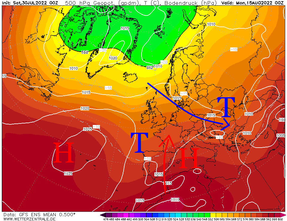 Wie auch immer die Szenarien ablaufen sollen, danach soll sich das Hoch über Nordwesteuropa wieder verziehen und es könnte sich abermals an der Seite des Azorenhochs ein Tief in Richtung iberische Halbinsel aufmachen. Über dem Mittelmeerraum würde sich ein neues Hoch etablieren, womit wir wieder zwischen den Luftmassen hängen würde. Der Tiefdruck über Nord- / Nordosteuropa würde eher leicht wechselhaftes und kühleres Wetter bringen, der Hochdruck über Südeuropa abermals heißes Wetter. Wir werden in den Ensembles gleich beide Varianten sehen können.