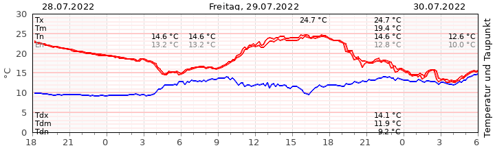 Um ein Haar hätten wir den mittlerweile 37. Sommertag eingeheimst. Mit 24,7 °C lagen wir nur knapp unter der 25,0 °C-Marke, die für einen Sommertag sprechen würde. Nach anfänglichen Schauern am frühen Morgen und vielen dichten Wolken riss der Himmel im Tagesverlauf auf und die Sonne kehrte zurück. Mit 19,4 °C war es wieder ein bisschen kühler als noch am Vortag, für NRW war dieser Tag um 0,1 °C kühler als in den vergangenen 30 Jahren für einen 29. Juli.