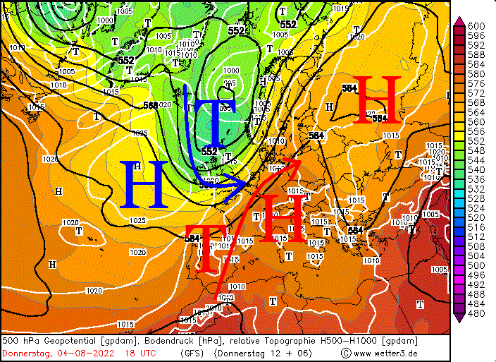 Heute gibt es die Druckgebilde nur in Paaren, abgesehen vom Sibirien-Hoch. Noch liegen wir auf der extrem heißen Seite des Tiefs über der iberischen Halbinsel und dem Hoch über dem südlichen Alpenraum. Diese Luftmasse wir nun in der Nacht verdrängt werden, genauer morgen früh. Im Vorfeld gibt es vereinzelte Schauerwellen, die uns etwas Regen bringen werden. Danach bricht die Kaltlfut aus dem Südwesten durch das Hoch über dem Nordatlantik und dem Tief nördlich von Schottland zu uns rein und lässt die Temperature in 1.500 Meter Höhe einmal von 18 °C in 1.500 Meter Höhe auf 5 °C absinken, womit auch die Höchstwerte bei uns wieder in Richtung 20 °C zurückwandern.