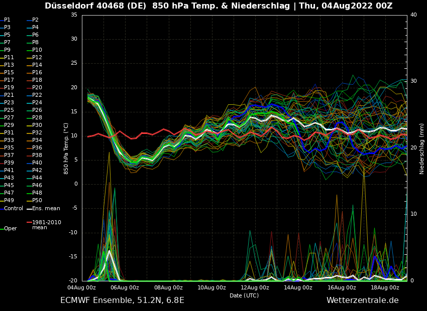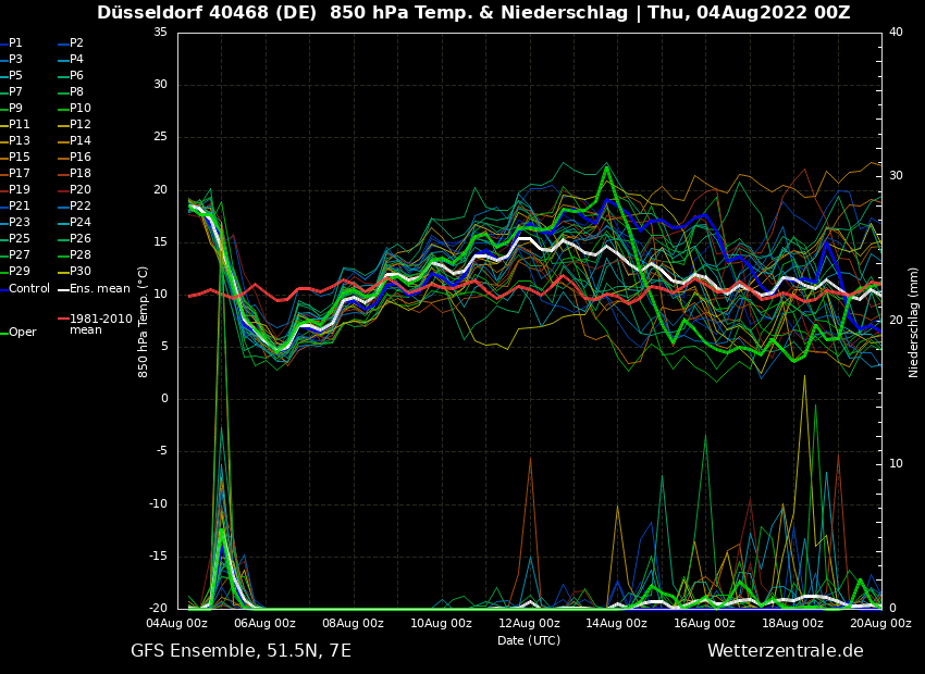 Wie so oft sind sich GFS und ECMWF relativ einig, denn auch hier ist die trockene Phase bis zum 12. August mit stetig ansteigenden Temperaturen zu sehen, ehe es dann kühler und nasser wird. Das Temperaturniveau ist hierbei nur minimal niedriger.