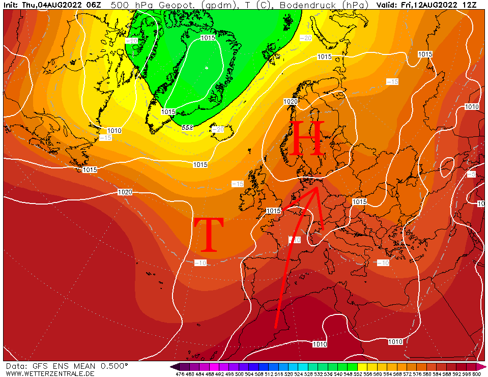 Wie in den vergangenen Tagen schon angesprochen brauchen wir uns derzeit so überhaupt gar keine Gedanken darüber machen, wann endlich Regen fallen wird, abgesehen natürlich von der kommenden Nacht. Aber mit Blick auf die gemittelte Großwetterlage zum Freitag nächster Woche zeigt sich auch die Ursache ganz eindeutig. Mit einem Hoch über Skandinavien liegen wir inmitten eine Hochdruckbrücke, die sich vor allem in der Höhe ausprägt. So liegen wir über einem stabilen Omega-Hoch, welches von zwei Tiefs westlich und östlich flankiert wird. Dies könnte das Ende eines von ständiger Hitze geprägten Hochsommers 2022 werden, denn so langsam wird es dann für den Sonnenstand schwerer solche Temperaturen jenseits der 30 °C zu produzieren.