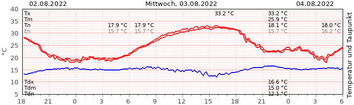 Gestern stiegen die Temperaturen dann wieder in den Hitzebereich zurück. Dabei gab es bis maximal 33,2 °C, die Tagesmitteltemperatur stieg auf 25,9 °C an und lag damit gut 5,4 °C über dem des langjährigen Mittels aus 30 Jahren für einen 3. August. Die Sonne schaffte es fast auf die maximale Ausbeute von gut 14 Stunden, zwischendurch wahren hohe Wolkenfelder wieder etwas kompakter unterwegs.