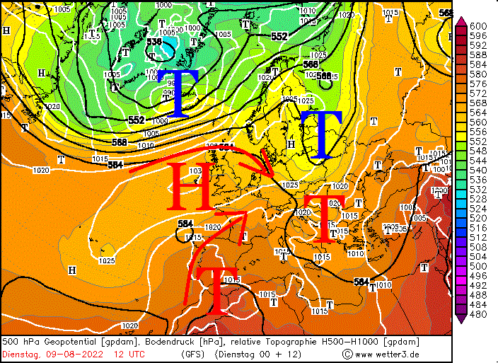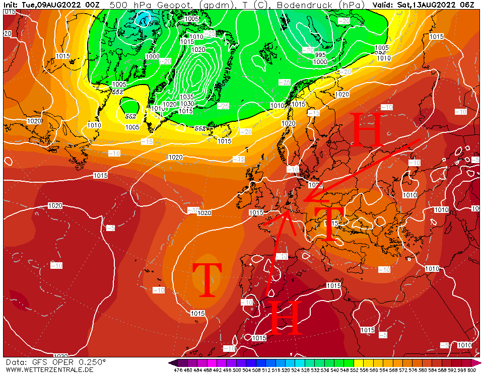 Das Hoch vor Irland wandert weiter munter in unsere Richtung und baut eine Brücke bis zur Ostsee auf, wobei das Hoch über der Ostsee am Boden stabil und in der Höhe recht instabil ist, sodass eher Wolken entstehen, was über den britischen Inseln und bei uns derzeit nicht der Fall ist. Dieses Hoch wird nun weiter bis nach Belarus ziehen und sich dort einnisten, womit dann folglich auch die Strömung von Nordwest auf Nordost drehen wird. Damit ist auch ein Hitzevorstoß aus dem Süden – nochmal Grüße an Herrn Jung – recht unwahrscheinlich für die kommenden Tage.
