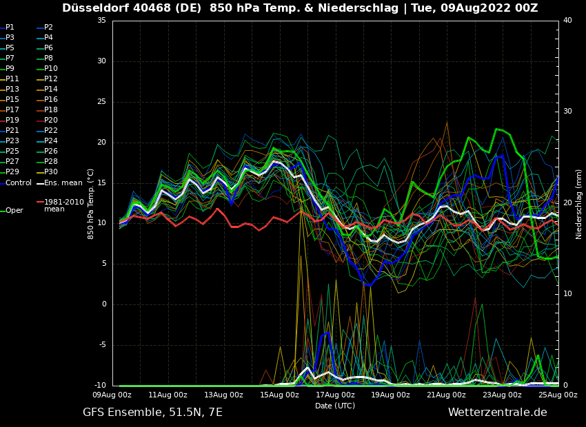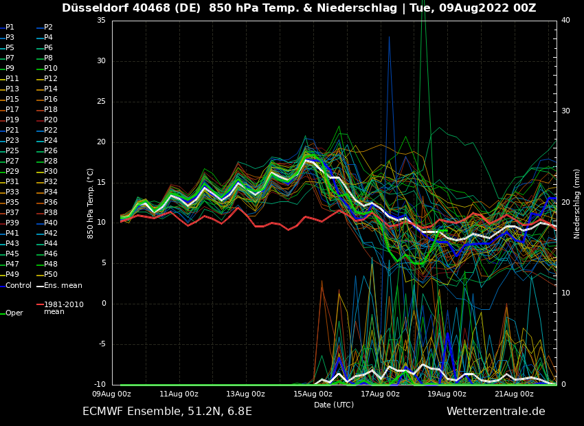 Die große Frage, die sich derzeit stellt, ist, ob das Höhentief über Österreich den Sprung über die Alpen zu uns schafft und somit die Hochdruckachse zwischen Nordafrika-Hoch und Osteuropahoch durchbrechen kann oder ob das Höhentief fern von uns bleibt. Stand jetzt soll es fern von uns bleiben und uns somit weiterhin bis Mitte nächster Woche am trockenen Arm verdursten lassen. Die Hochdruckachse soll demnach zwar Mitte nächster Woche in sich zusammenfallen, wenn das Tief vor der iberischen Halbinsel zu uns zieht und die kühle wechselhafte Luft aus dem Norden anzapft. Der Hauptlauf sieht es bis zum 23. August weiterhin äußerst Trocken mit uns, der große Regen soll demnach nur über den Süden und Osten kommen. So zumindest der 0er Lauf von heute Nacht, gestern Mittag wurden noch 20-30 Liter pro m² berechnet.