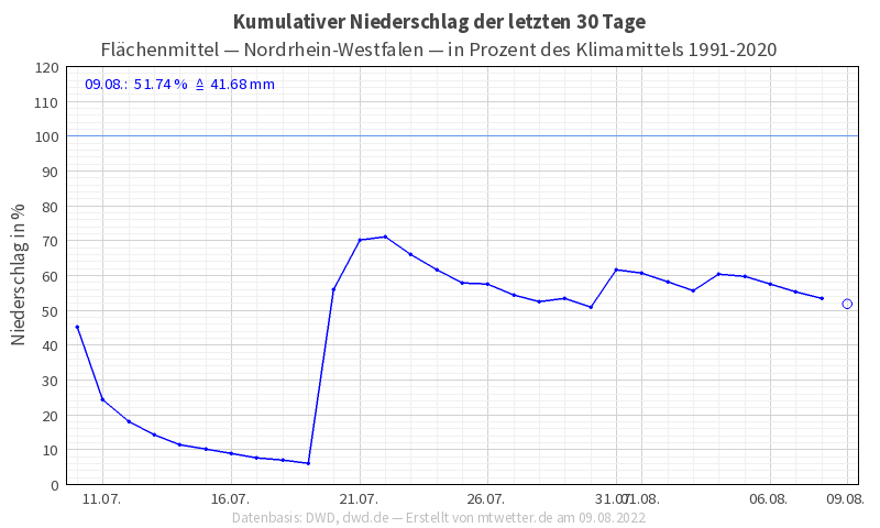 Aktuell hängen wir, was den Niederschlag angeht, so richtig durch. Gerade einmal 41,68 Liter pro m² sind in NRW gemittelt gefallen, in Düsseldorf waren es 31,7 Liter pro m². Da es aber insgesamt im Südwesten unseres Landes viel zu trocken ist, sinkt auch der Pegel an unserem heißgeliebten Rhein immer weiter. Aktuell liegt dieser bei 47 cm und dürfte weiter sinken, zumindest noch die kommenden 7 Tage. Damit liegt er noch 24 cm über dem niedrigsten Wert aus 2018. Diesen werden wir laut ELWIS aber wohl nicht erreichen. Schöne Grüße an dieser Stelle am Dominik Jung, der gestern vom Austrocknen des Rheins gesprochen hat. Und da sei auch noch angemerkt, dass der Pegelstand nicht die Wasserhöhe am niedrigsten Punkt und bei „nur“ 47 cm nun die große Badesause angestimmt werden kann, weil das Wasser einem ja nur bis zu den Knien gehen würde.
