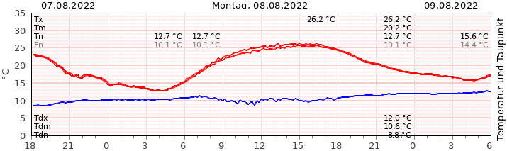 Gestern hat die Sonne wieder einmal alles aus der Luftmasse herausgeholt und uns mit 26,2 °C einen ganz leicht wärmeren Tag beschert, als wir ihn am Sonntag noch hatten (26,1 °C). Dazu schien die Sonne in der ersten Tageshälfte erst noch unter hohen Schleierwolken, ab dem Mittag gab es dann blauen Himmel satt. Die Tagesmitteltemperatur stieg auf 20,2 °C an und lag damit 0,2 °C unter dem langjährigen Mittel aus den vergangenen 30 Jahren für einen 8. August.