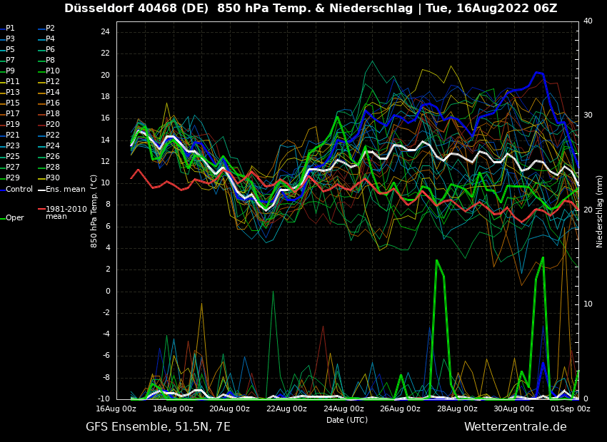 Wie wir am Ensemble sehen können, ist diese Berechnung kaum in Ensemble abgebildet und somit äußerst unwahrscheinlich. Ich wollte euch die Berechnung trotzdem einmal zeigen, weil ich sie recht spannend fand. In den kommenden Tagen gibt es etwas Niederschlag, die Temperaturen gehen nach und nach zurück. In der neuen Woche sollen die Temperaturen dann wieder deutlich ansteigen, im Mittel auf 14 °C in 1.500 Meter Höhe, womit Hitzetage ab dem 24. August wieder wahrscheinlicher werden. Dazu kaum Regen, alles wie gehabt.