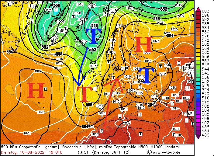 Richtig Spannung gibt die Großwetterlage für den kommenden Freitag nicht mehr her, also springen wir mal eine Woche weiter. Und dabei möchte ich auf die heiße Phase zu Ende nächster Woche eingehen, weil dort ja seit geraumer Zeit Hitze und Trockenheit im Gespräch ist. Wenn ihr mich fragt, wird das auch so kommen, aber zumindest hat das amerikanische GFS mit seinem aktuellen Hauptlauf eine klassische Regenwetterlage gebastelt, die uns Regen ohne Ende (60 Liter) bringen würde. Wir haben ein nach Norden verlagertes Azorenhoch, welches keine Brücke zum Osteuropa-Hoch aufgebaut bekommen soll. Dazwischen soll sich ein Höhentief einnisten, welches die warme Luft mit Feuchtigkeit versetzt und diese Feuchtigkeit nach und nach ausquetscht.