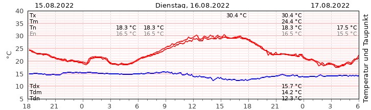 Mit dieser Grafik sind wir auch wieder auf Hitzewegen zurück, denn die Temperaturen stiegen nach einem Tag Abstinenz wieder auf über 30 °C (30,4 °C). Auch die Tagesmitteltemperatur stieg wieder deutlich an und lag bei 24,4 °C, womit der gestrige Tag gut 4,6 °C wärmer war als die vergangenen 30 Jahre für einen 16. August.
