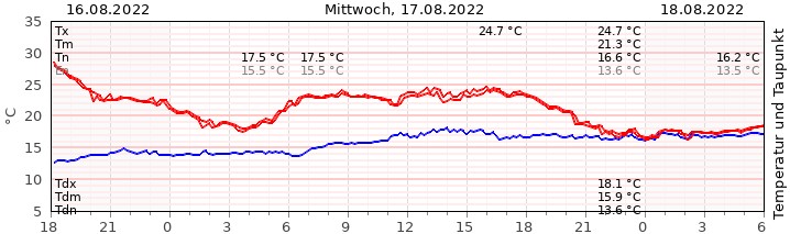 Zum gestrigen Tag gibt es eigentlich nur 2 Dinge zu sagen. Überraschenderweise sind die Temperaturen unterhalb der 25 °C Marke geblieben, denn die Höchstwerte lagen bei 24,7 °C. Gleich zwei Anläufe gab es über diese Marke, gegen 15 Uhr und gegen 18 Uhr, beide mal gab es Schauer im Umfeld, die die Temperaturen gleich wieder gedrückt haben. Aber leider nicht bei uns, die Messstation lieferte weniger als 0,1 Liter pro m² gegen 13:15 Uhr. Zum Ende des Tages wurschtelte sich die Sonne nochmal durch bei auflockernde Bewölkung. Die mittelten 21,3 °C waren relativ schwül anzufühlen, insgesamt war der Tag auf NRW bezogen rund 3,4 °C wärmer als die vergangenen 30 Jahre für einen 17. August.