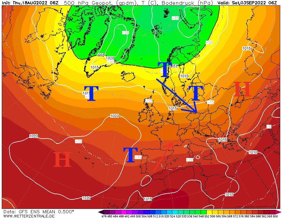 Wir blicken ja schon seit geraumer Zeit auf Großwetterlagen, die Regen bringen könnten, es dann aber letztendlich gar nicht tun oder vorher wieder rausgerechnet werden. Deshalb werfen wir heute mal einen Blick auf das, was wir immer am Ende eines jeden 16-Tage-Trends sehen. Die weiße Linie der Temperatur oben und der Niederschläge unten. Demnach sollen wir es in Anfang September mit einem Azoren- und einem Kontinentalhoch zu tun bekommen, die keine Brücke zueinander aufbauen und sich stattdessen Tiefs eingraben, die dann auch uns beschäftigen würden. Entscheidend sind hierbei 2 Linien, die wir gesondert betrachten. Zum einen die gestrichelte -15 Linie, die für die Isotherme (Linie gleicher Temperatur) -15 °C in 5.500 Meter steht. Je weiter sie nach Süden vorankommt, desto weiter südlich liegt die Zone mit instabilem Schauerwetter. Und diese kommt gemittelt immer weiter nach Süden voran, soll Anfang September aber noch nördlich von uns liegen. Zum anderen die schwarze 552er Linie, die die Isobare (Linie gleichen Luftdrucks) von 552 hPa in 5.500 Meter Höhe zeigen soll. Diese stellt häufig auch den Unterschied zwischen warmer Luft im Süden davon und kalter Luft im Norden davon dar. Diese Linie ist noch sehr weit nördlich von uns, entsprechend weit dürfte auch der Herbst von uns entfernt liegen.