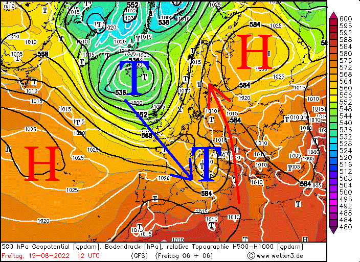 Hey, da ist ja richtig Struktur drin. Ein kräftiges Hoch über den Azoren, ein kräftiges Hoch über dem Kontinent, ein kräftiges Tief bei Island. Alles, was wir typisch für Europa nennen können. Dazu kommt noch ein Tief, welches sich in das höhere Geopotential über Mitteleuropa eingräbt und dort für anhaltenden ergiebigen Regen mit zahlreichen Gewittern mit Unwettergefahr sorgt. Dieses Tief zieht in Richtung Adria und schickt einerseits Regen in den Osten von Deutschland sowie angrenzende Länder sowie teils Überschwemmungen in Teilen des Balkans.