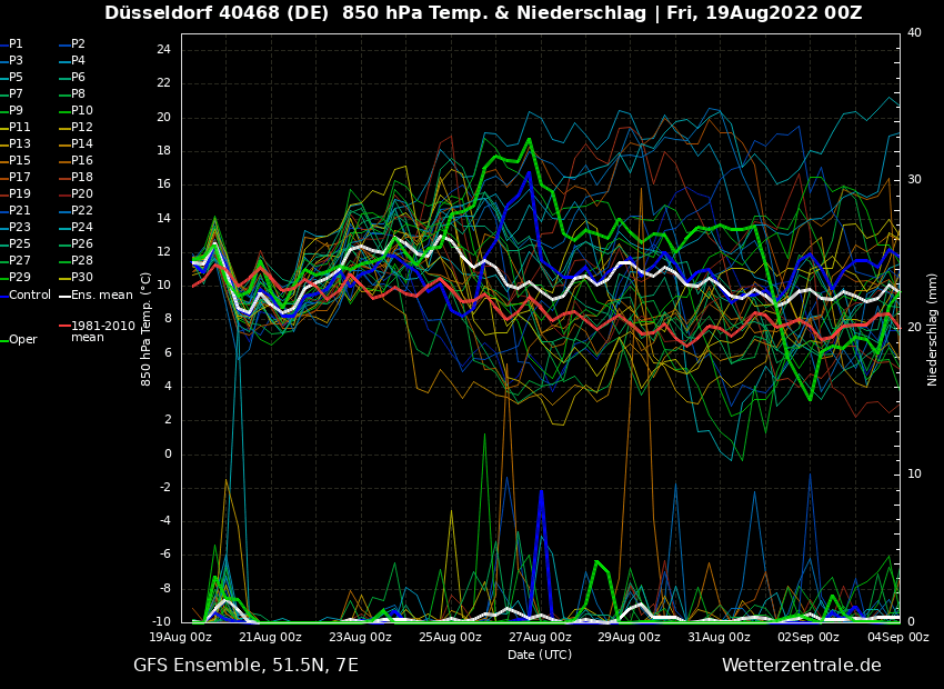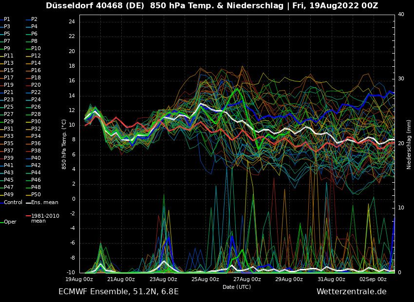 Dies sehen wir auch im Ensemble ganz gut abgebildet. Bevor sich dieses Hoch etabliert, sollen die Temperaturen nochmal relativ weit nach oben schießen. Dann soll aber ein Riegel vorgelegt werden, womit die Temperaturen nicht über 14 °C in 1.500 Meter Höhe hinauskommen sollen. Einzelne extreme Läufe sind zwar noch dabei, aber die erachte ich als relativ unwahrscheinlich. Der 6er Lauf sieht das im Übrigen, während er noch rechnet, etwas optimisitischer. Größte Chance auf Regen ist in der kommenden Nacht.