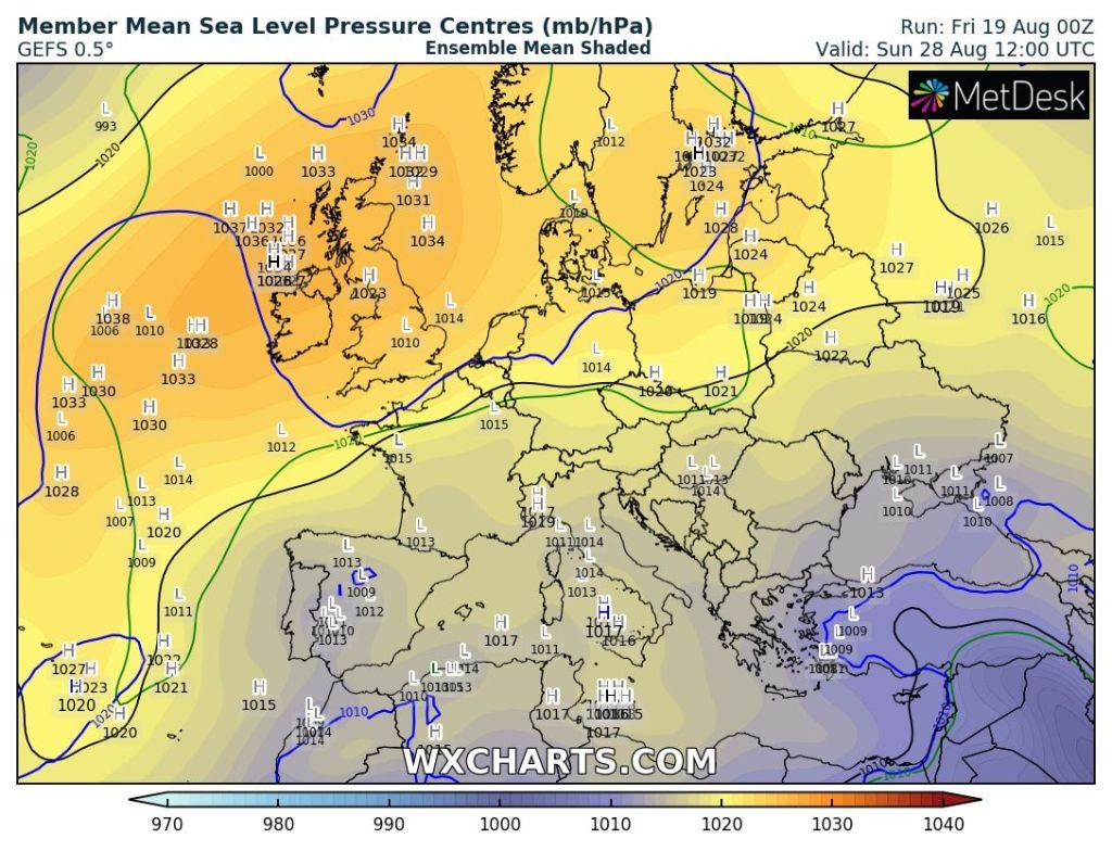 Szenario 1: Da wäre zum einen das Hoch über den britischen Inseln, was auch über den britischen Inseln liegt. Damit würde der Atlantik geblockt werden und die Luftströmung auf Nordost / Ost gestellt werden. Diese Luft wäre warm, teils trocken und ohne jegliche Hoffnung auf Regen.