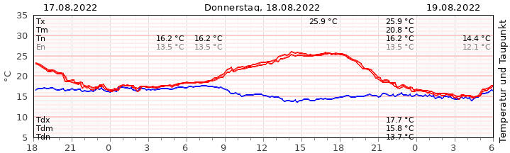 Wir sind wieder zurück auf sommerlichem Terrain. Mit 25,9 °C als Höchsttemperatur haben wir die sommerliche Marke von 25,0 °C wieder überschritten. Durch die hohe Luftfeuchtigkeit sinken auch die Nachttemperaturen auf gerade einmal 16,2 °C, sodass auch die Tagesmitteltemperatur mit 20,8 °C weiterhin ziemlich warm war. Im Vergleich zu den vergangenen 30 Jahren für einen 18. August lagen wir in NRW gemittelt 2,9 °C über dem Klimamittel. Dazu gab es viele Wolken und tatsächlich <0,1 Liter pro m² Regen. Dem ist nichts hinzuzufügen.