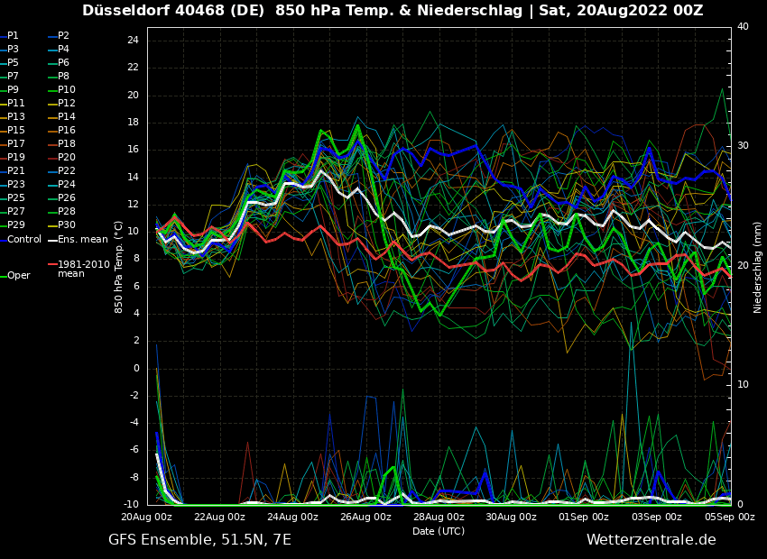 „Leider“ deckt sich das auch ganz gut mit dem Ensemble. Hitzeritt bis zum 25. August, danach kühler, zeitweise etwas wechselhafter, danach wieder trockener. Aber: Die Modelle gehen ab dem 25. August ziemlich auseinander, was die Temperatur angeht. Sprich hier ist noch eine große Unsicherheit über die genaue Wetterlage. Einigkeit ist da eher beim Niederschlag, der nur recht sporadisch berechnet wird.