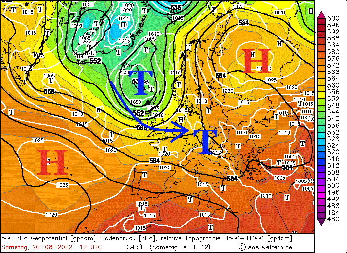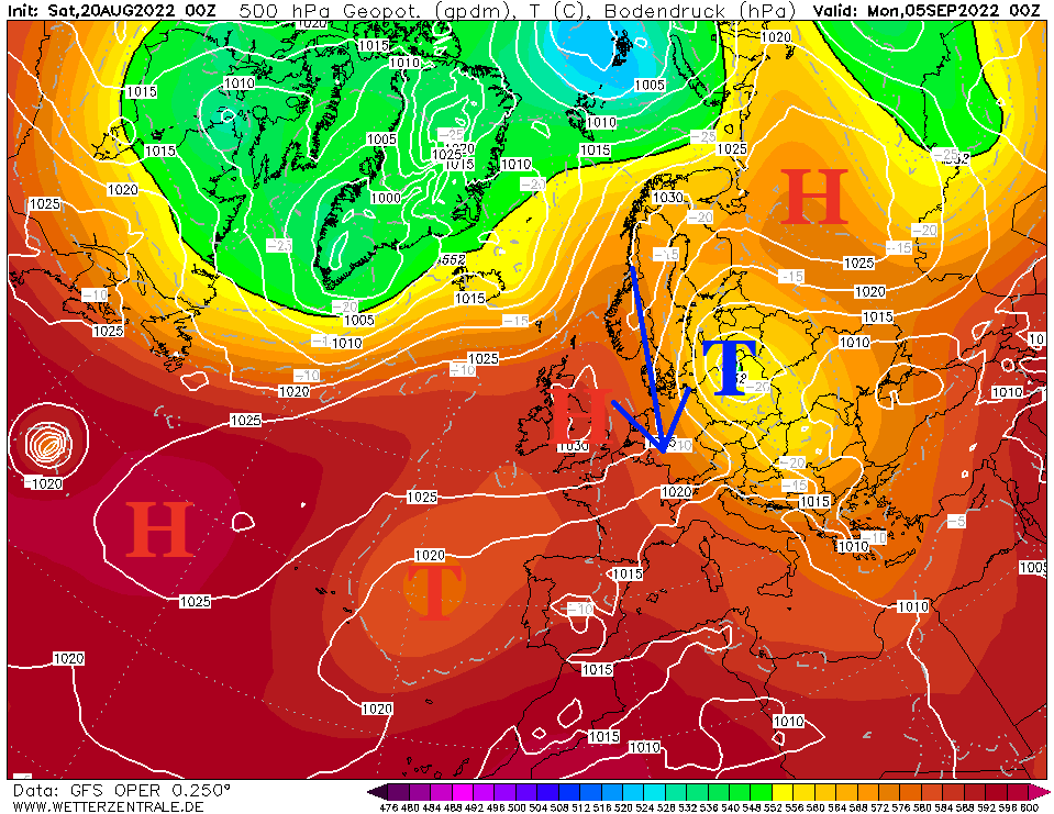 Zwischenzeitlich kommt mal etwas kühlere Luft zu uns. Mit dem Tief über dem Nordmeer hat sich eine kleine Kaltfront zu uns bewegt, die uns den Regen am morgen brachte. Dahinter sickert mal etwas kühlere Luft ein, die in 1.500 Meter Höhe bei etwa 10 °C liegt. Das reicht zwar immer noch für 25 °C als Tageshöchstwerte, aber die Luft ist jetzt nicht mehr so schwül und das wird uns etwas angenehmer vorkommen. Spätestens zu Mitte der nächsten Woche wölbt sich die Hitze aus dem Südwesten wieder neu auf, vermutlich ein letztes Mal in diesem Sommer.