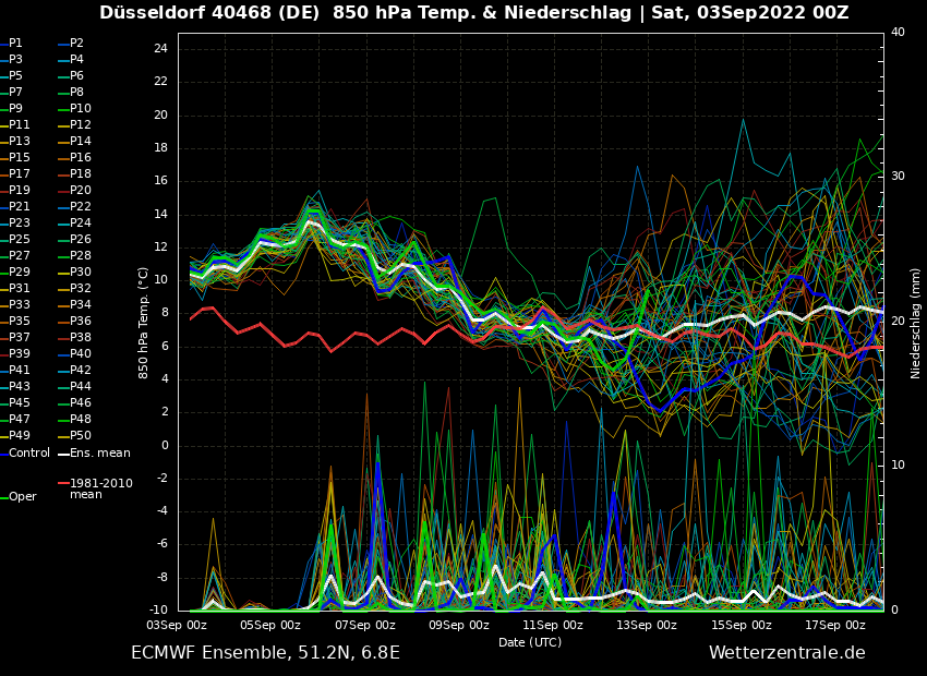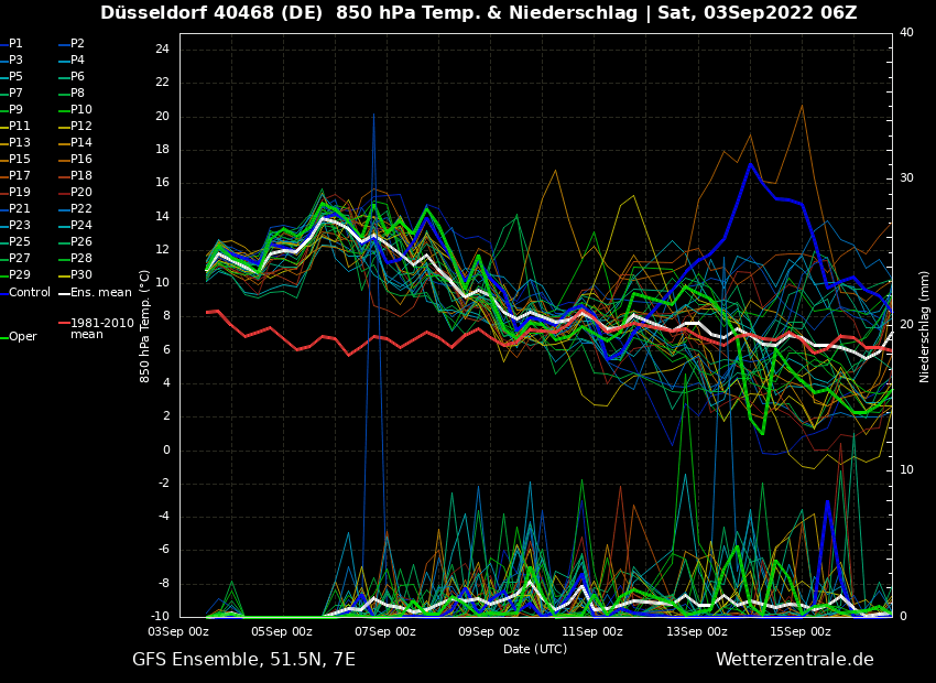 Und das zeigt auch das Ensemble ganz gut. Aktuell noch trocken und teils heiß, danach gehen die Temperaturen zurück auf durchschnittliche Werte und es sind massig Niederschlagssignale dabei. Dem Sommer geht der Gar aus.