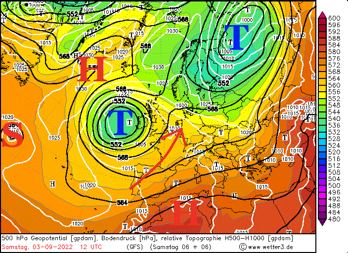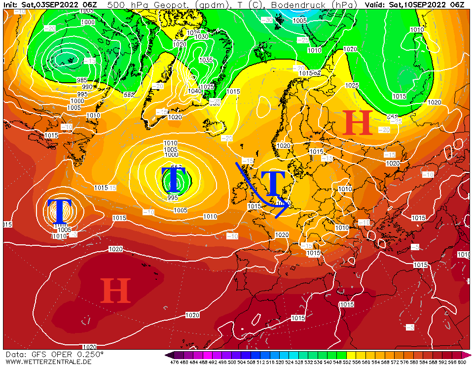 Und so dürfte es nächste Woche Samstag aussehen. Ein schwaches Tief über der Nordsee würde uns recht schauerreiches Wetter bringen mit einer kühlen Nordwestströmung und Tageshöchstwerten von teils unter 20 °C. Dahinter folgen auf dem Atlantik Ex-Danielle und Earl, beides Tropenstürme. Danielle soll bis dahin bereits ein außertropisches Sturmtief sein, Earl dann noch ein Tropensturm, wird sich dann Ex-Danielle anschließen und ebenfalls ein außertropisches Sturmtief werden. Ansonsten kräftiges Azorenhoch, Hoch über dem östlichen Balkan und damit eine frühherbstliche Großwetterlage.