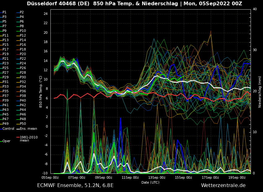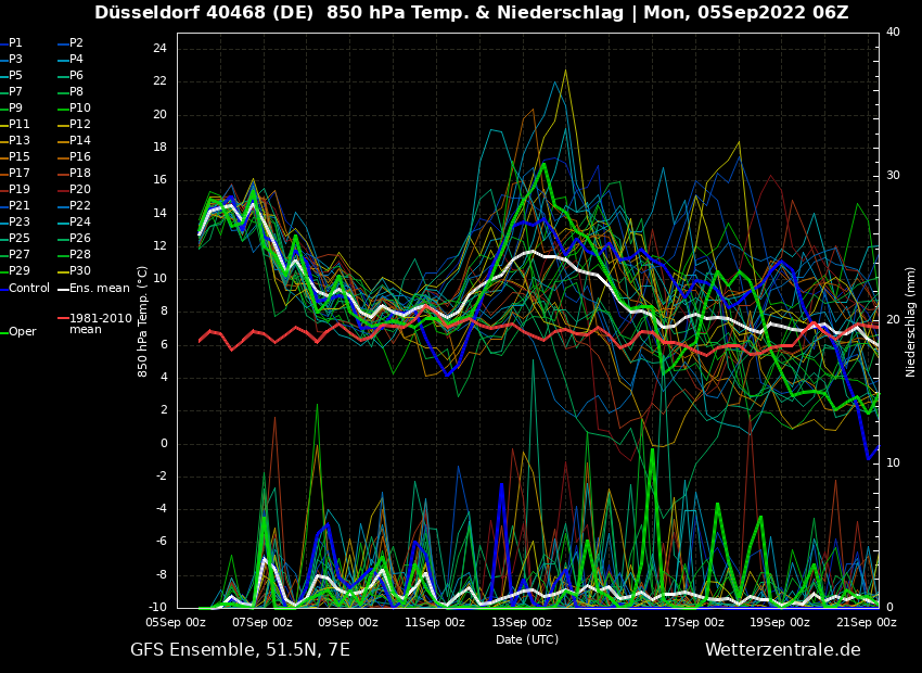 Vorab: Die Temperaturen gehen nun deutlich zurück um gut 10 °C, dazu gibt es einige Niederschläge, insbesondere in Form von Schauern. Danach wölben sich so gut wie alle Modelle wieder auf und bringen erneut wärme, einzelne Modelle springen gar auf 22 °C, das im September zwar sicherlich nicht mehr für 40 °C reichen würde, wie noch im Juli oder August, aber 35 °C wären damit durchaus möglich. Das sind aber extreme Läufe, die erste Hürde mit 30 °C müssten wir erstmal erreichen. Das ist aus dem Ensemble noch nicht ersichtlich. Was aber ersichtlich ist, ist dass dieses stabile kurze Hitzeintermezzo, wie es der Hauptlauf berechnet, nicht unbedingt im Ensemble abgebildet ist. Denn die Niederschlagssignale bleiben bis zum 21. September durchweg aktiv, wenn auch diese zum Ende des Vorhersagezeitraums etwas abnehmen.
