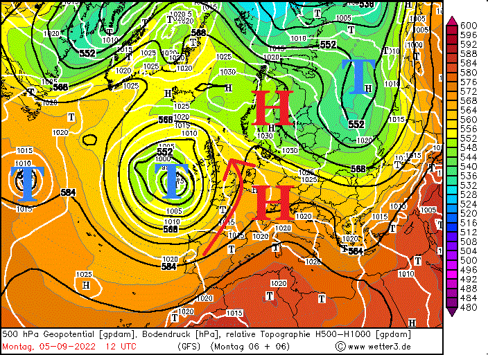 Das Hoch über dem Alpenraum wölbt sich weiter nach Norden auf und bildet eine Achse mit dem Hoch über Skandinavien. Westlich und östlich davon liegen Tiefs, die für einen regen Austausch der kalten Luftmassen über Nordeuropa mit den heißen Luftmassen über Südeuropa sorgen. Diese Zone mit kalt über dem Atlantik, warm über Mitteleuropa, wird sich ab Mittwoch nach Osten verschieben.